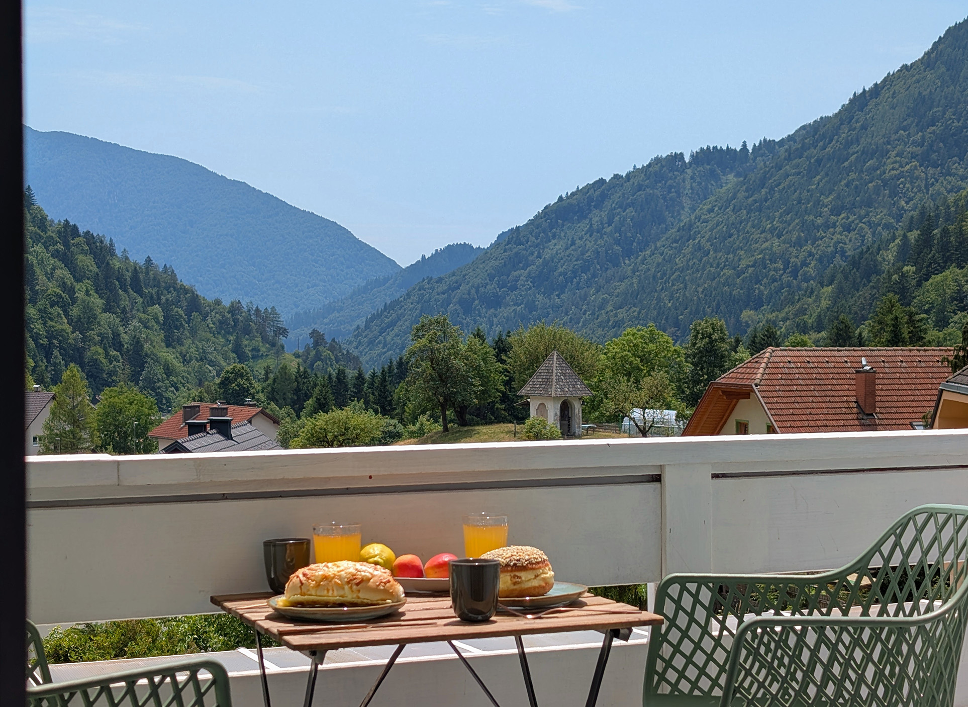 From the room and from the balcony with a beautiful view of the Slovenian mountains.
