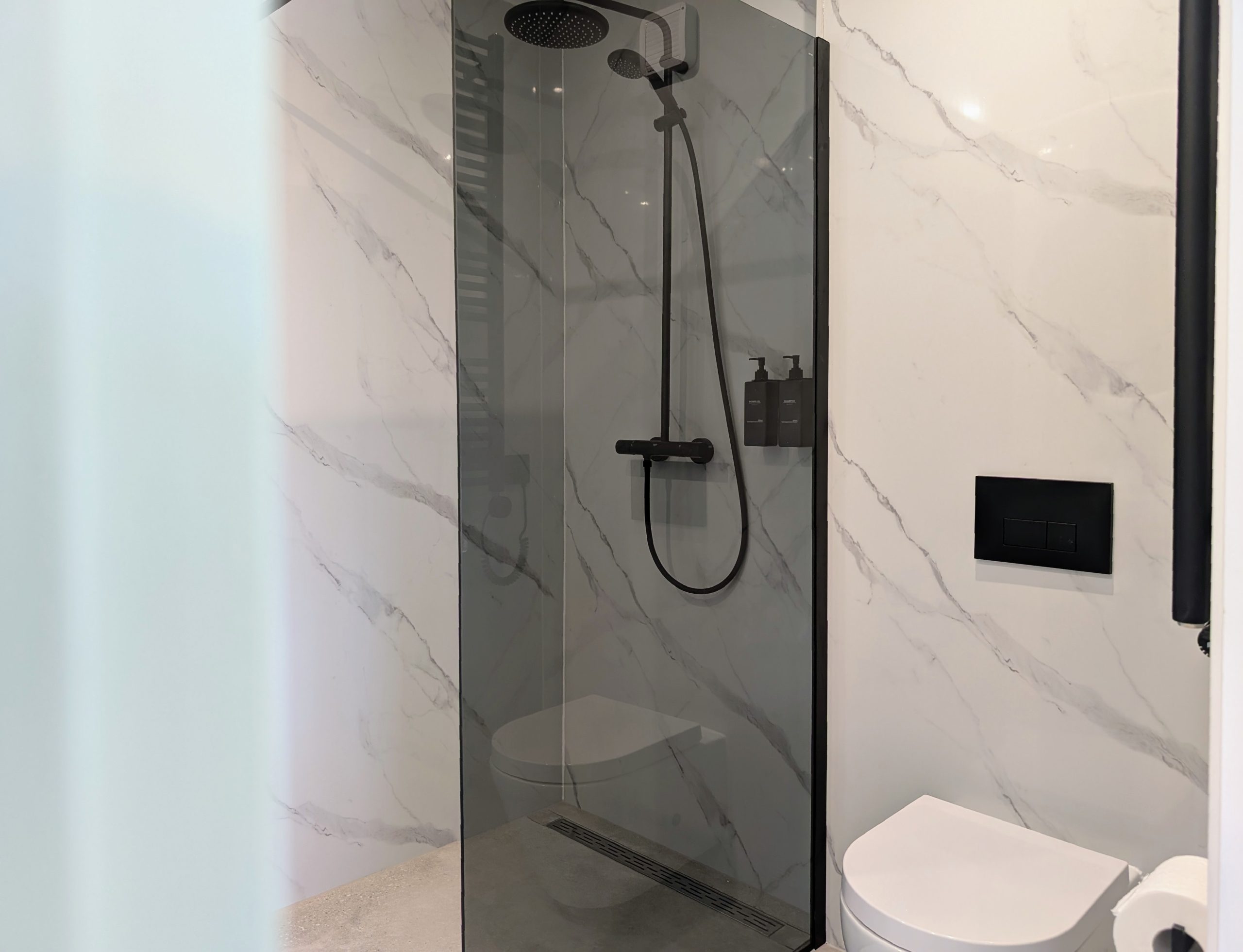 The spacious bathroom has a walk-in shower with rain shower, a toilet and a modern washbasin.